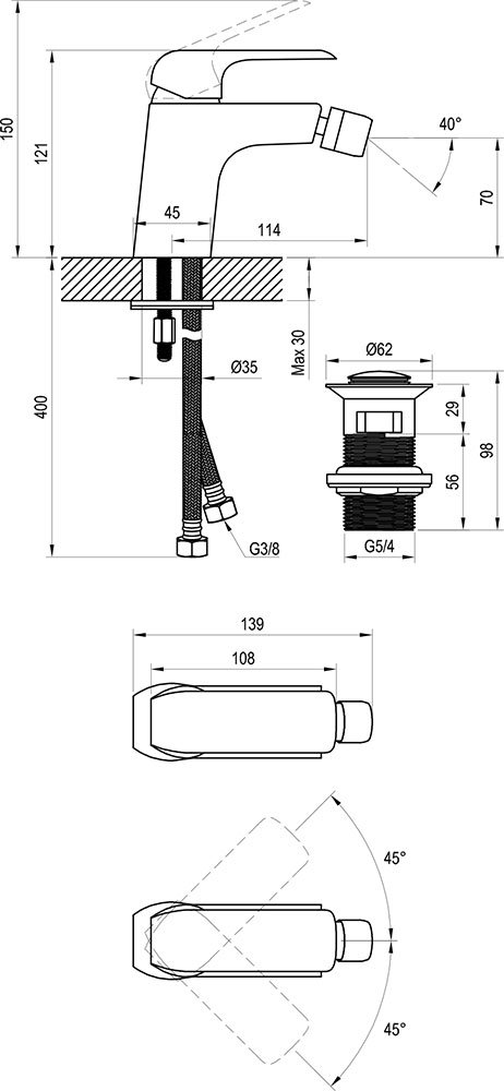 Одноважільний змішувач для біде Flat FL 055.20 з відкриванням стоку встановлюється в біде. У комплект входять донний клапан і шланги підведення води.