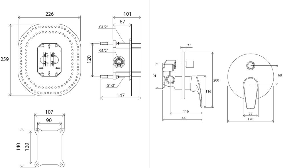 - R-box складається з пластикової основи та нижньої частини змішувача прихованого монтажу, виготовленої з латуні.