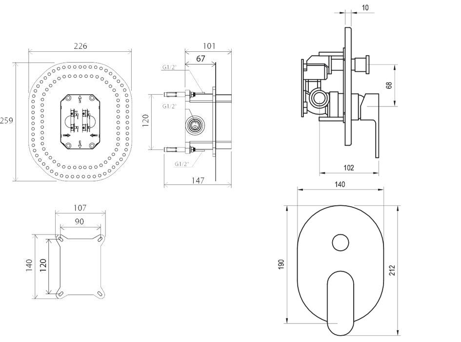 R-box містить матеріал для кріплення до стіни, не містить підключення до води. R-box за допомогою пластикової заглушки, що входить у комплект, забезпечує повну функціональність водопровідної системи без необхідності встановлення верхньої частини.
