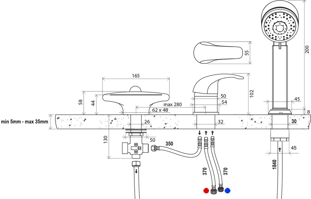 - перемикач ванна/душ, з лійкою;