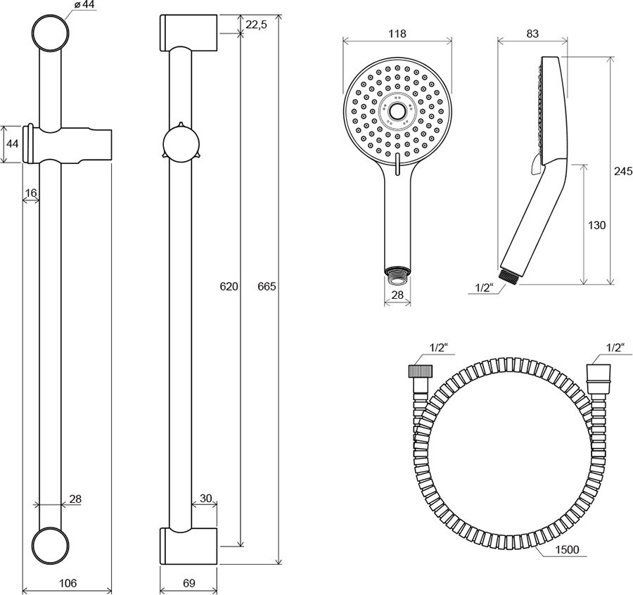 Душовий тримач: 60 см, рухомий; душовий шланг: 150 см, металевий; лійка ручного душу |