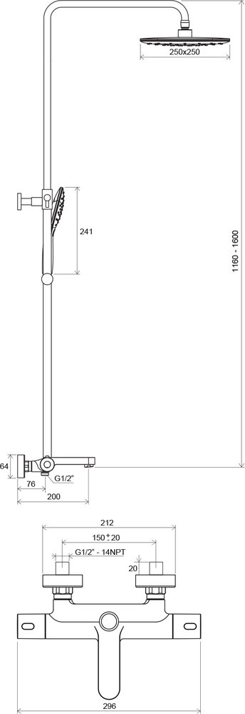 - Висота штанги: дозволяє в будь-який час просто відрегулювати висоту верхнього душу від 160 см;