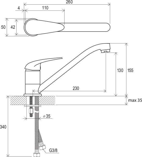 - гнучкі з'єднувальні шланги завдовжки 360 мм, розмір G3/8;