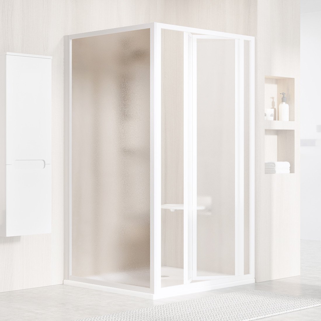 Нерухомі стінки дозволяють відокремити простір для приймання водних процедур та зробити його практично будь-якого розміру. Залежно від задуму перегородки доповнюються піддоном або створюється безбар’єрний простір. В останньому випадку додатково використовується душовий канал чи трап. До інших переваг використання стаціонарних стінок відносять: