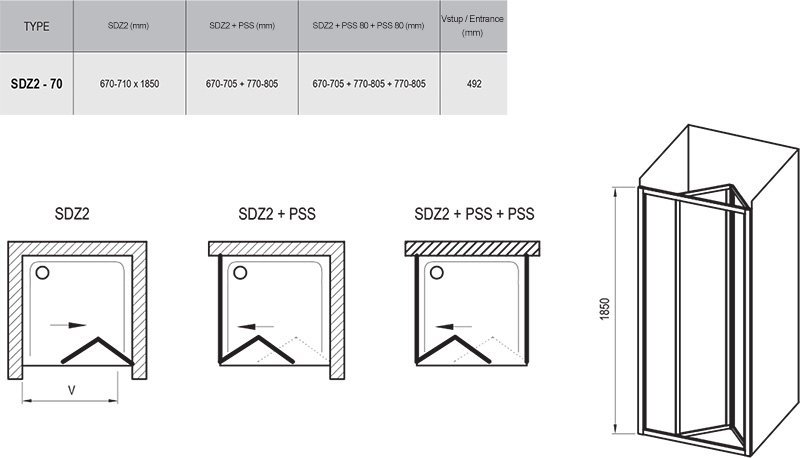 Підходять для найменших душових куточків завширшки 67-71 см. Складані двері забезпечують максимально можливу ширину входу.
