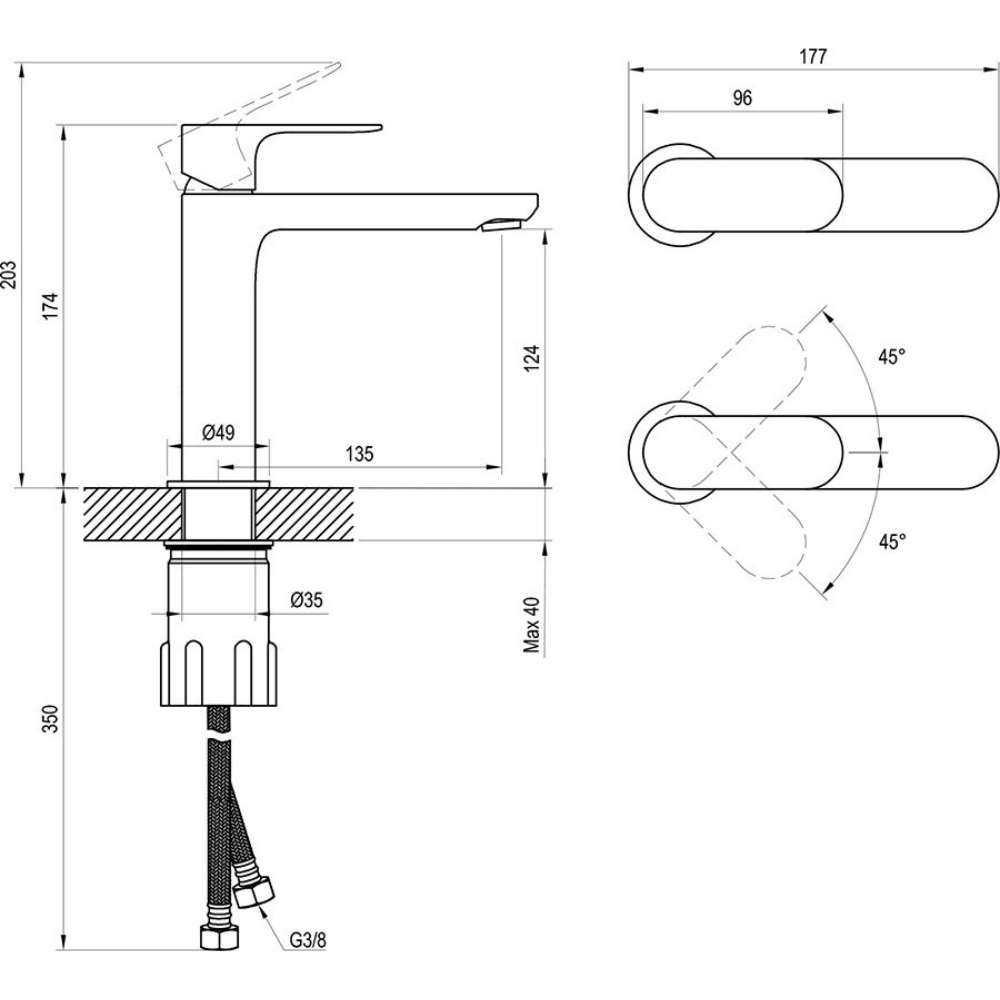 - соединительные шланги: гибкие, 450 мм, диаметр G3/8;