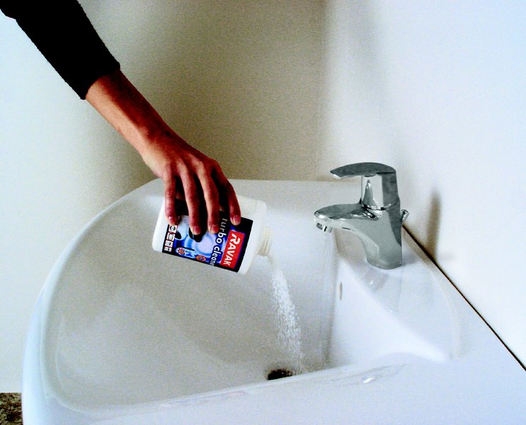 Насыпьте в раковину 30 – 90 г средства, залейте 0,1 – 0,4 л горячей воды (в зависимости от количества средства), оставьте как минимум на 30 мин, а потом смойте холодной водой.
