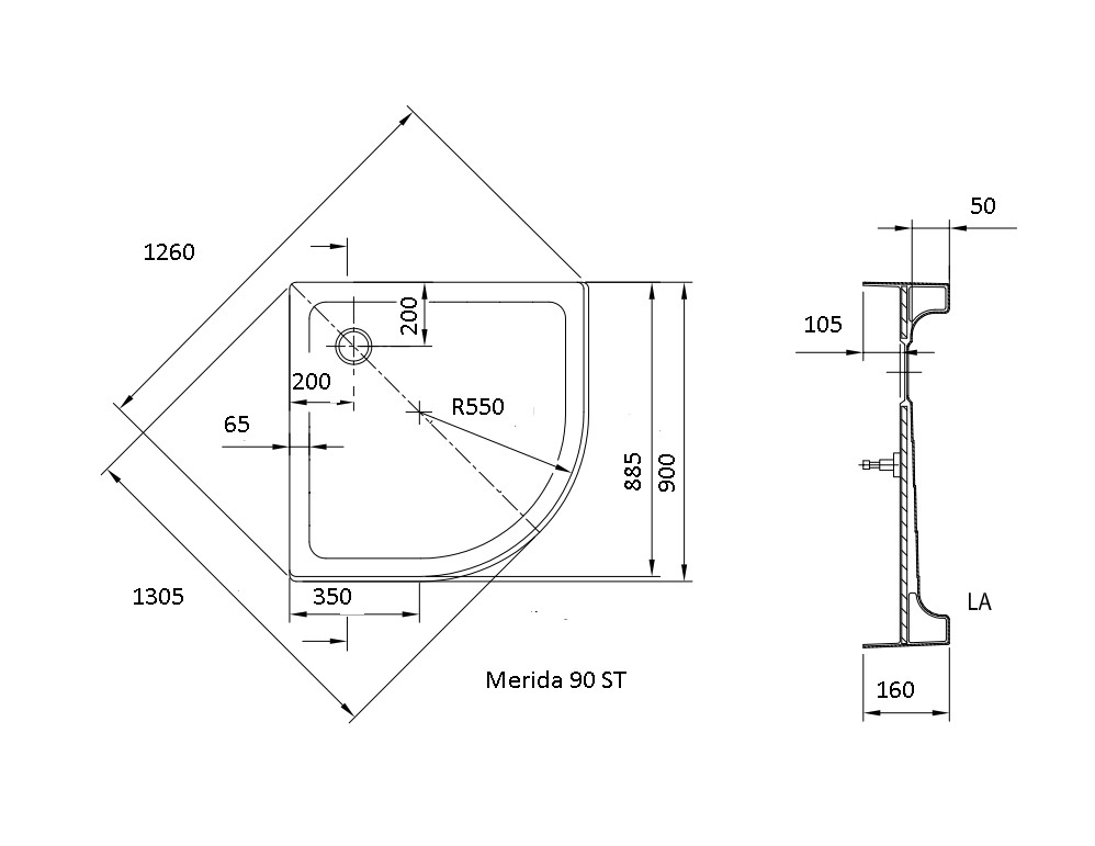 Полукруглый поддон MERIDA ST R550 для душа- в размере 90 Х 90 см;