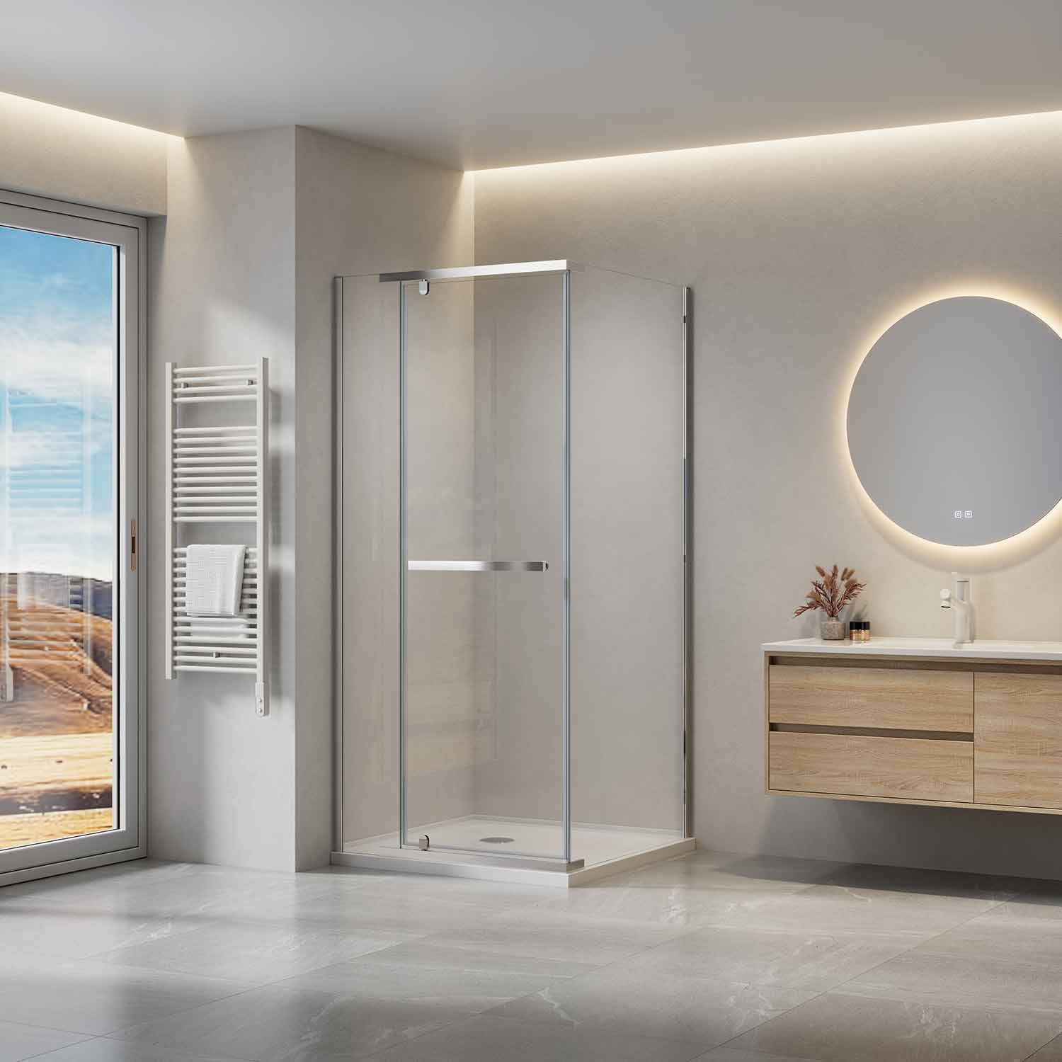 Душова кабінка універсальна R\L поставляється з ручкою 50 см, верхній та нижній тримач виготовлений із нержавіючої сталі. |